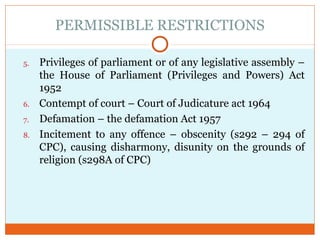 4 Permissible limitations of the ICCPR right to freedom of expression. Defamation is a crime under Section 499 and Section 500 of IPC. It also protects its citizens to speak against the religion or to criticise some religion.
